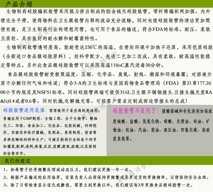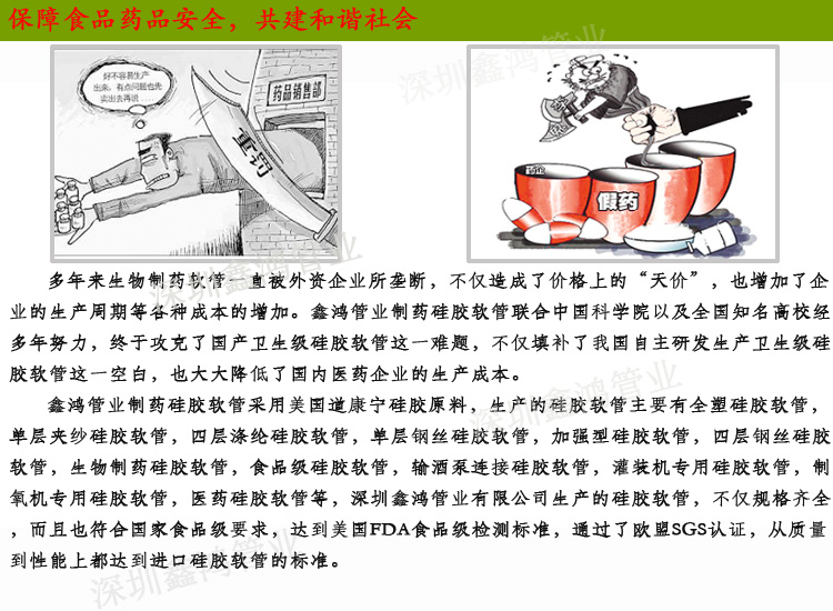 鑫鸿管业制药硅胶软管采用美国道康宁硅胶原料,生产的硅胶软管主要有硅胶钢丝软管,单层编织硅胶软管,四层硅胶编织软管,单层钢丝硅胶软管,医用硅胶软管等,生物制药硅胶软管生产的硅胶软管,不仅规格齐全,而且也符合国家食品级要求,达到美国FDA食品级检测标准,通过了欧盟SGS认证,从质量到性能上都达到进口硅胶软管的标准。