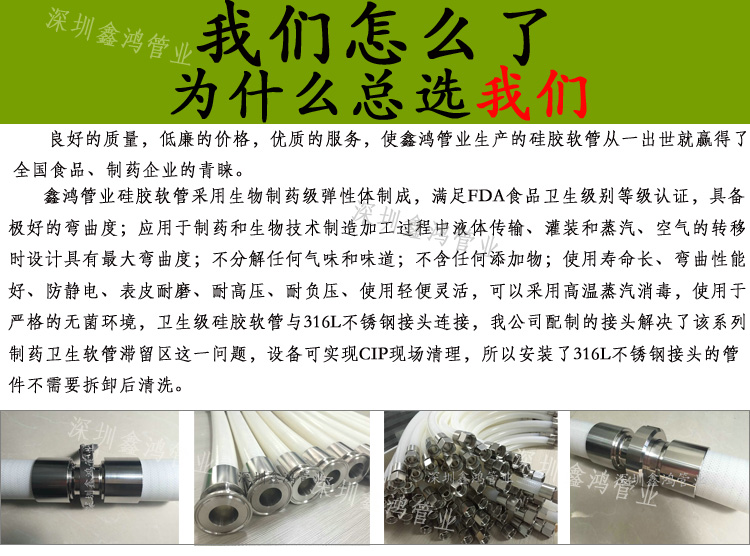 很多客户遇到这样的烦恼,食品级软管购买之后不能直接使用,需要再采购配件配套扣压,或者找不到合适的配件配套,繁琐的过程给客户带来不必要的困扰,鑫鸿管业针对不同的食品卫生硅胶管产品,结合自身丰富的产品经验为客户提供各类接头等加工配套服务,完成产品一体化,真正满足客户的需求。
